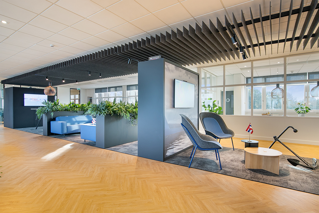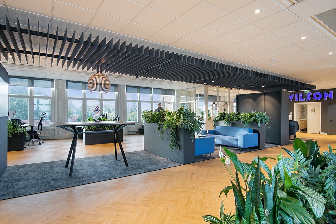 Artemis Interieur ontwierp een uniek Baffle plafond voor in hun ontwerp van het kantoor van Wilson Agency. Bij binnenkomst loop je tegen de kopse kant van de ontworpen middenkern aan, deze wordt gevormd door een lange loper met onze akoestische Baffles erboven, waar verschillende functies tussen geplaatst zijn.